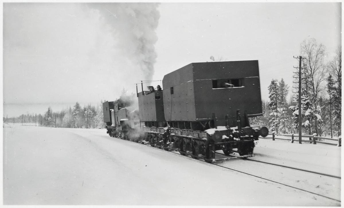 Pansartåg 2 BODEN vid Riksgränsen. Statens Järnvägar, SJ J 1390 med ombyggda malmvagnar SJ Mas 15817, SJ Mas 15837, SJ Mas 15858.