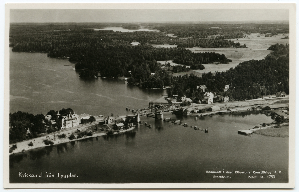 Flygfoto taget från nordväst över samhället Kvicksund som ligger på båda sidorna av Kvicksundsbron i Mälaren som ses i mitten av bilden. Den södra delen ligger i Södermanland i nuvarande Eskilstuna kommun och den norra i Västmanland i nuvarande Västerås kommun. Till vänster i bild på den norra sidan av samhället som ligger på Nyckelön ser vi hotellet. Till höger i bild på den södra sidan skymtar ortens järnvägsstation.