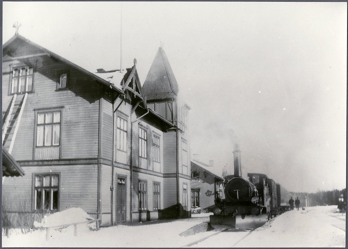 Titel: Stationen anlades 1879. Pingstaftonens förmiddag 1910 brann stationen ned till grunden tillsammans med Hotell Drott, Lilla Hotellet och Järnvägshotellet. Stationsbyggnaden var från sitt ursprungliga skick påbyggd med en våning, samt en farstu norrut. 1912 stod det nya stationshuset färdigt. Intill dess användes en reservstation i en fastighet som tillhörde DJ och som låg vid spårområdet på södra sidan. DJ , Dalslands Järnväg