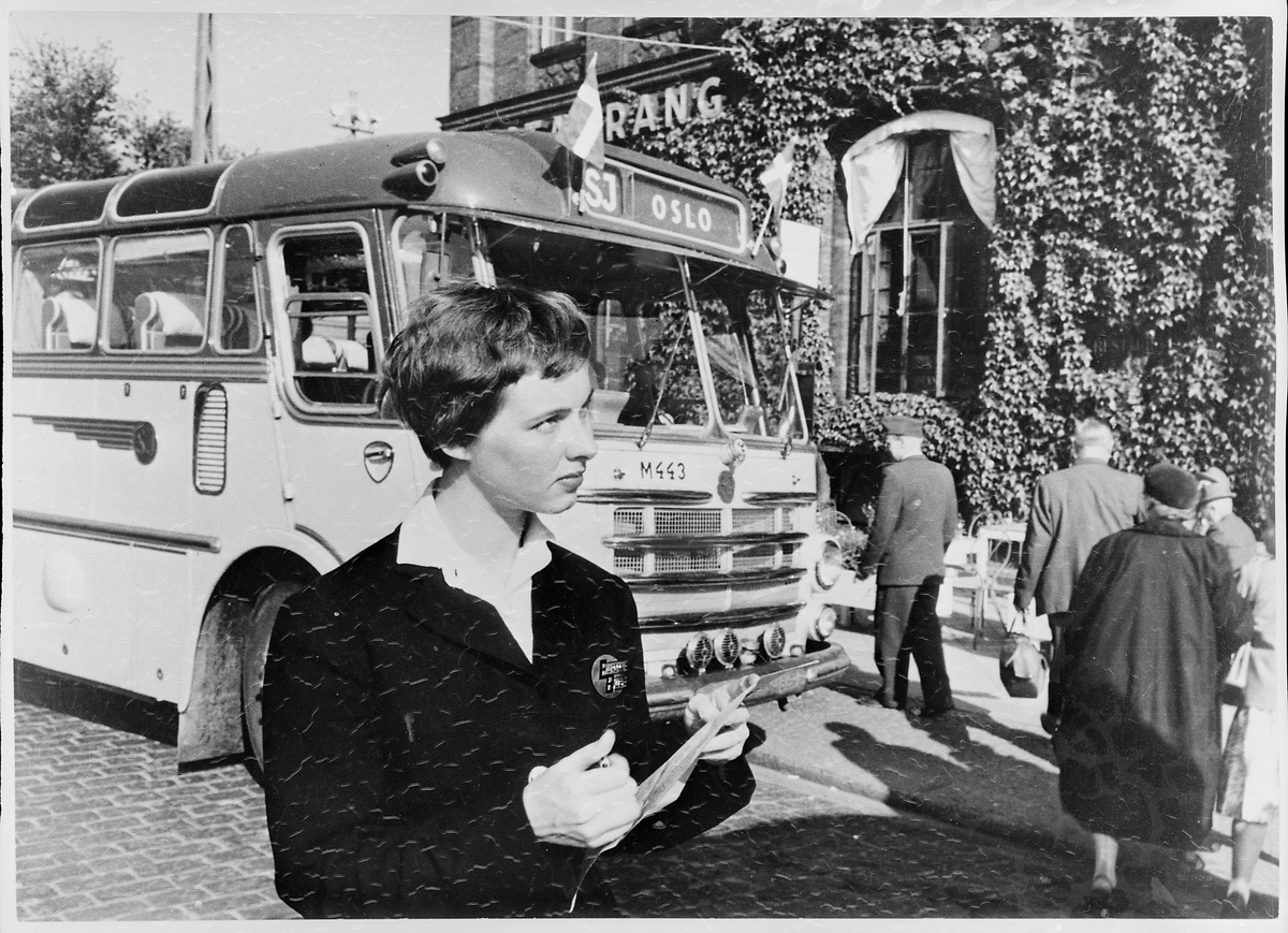 Bussvärdinna och resande vid, Statens Järnvägar, SJ buss till Oslo. Här vid Malmö centralstation.
