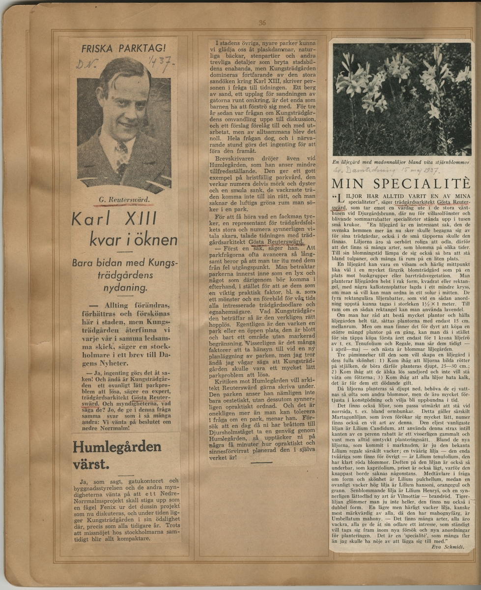 Tidningsklipp ur "Uppsatser om trädgårdar m.m. som på ett eller annat sätt beröra Gösta Reuterswärd 1931-1943".