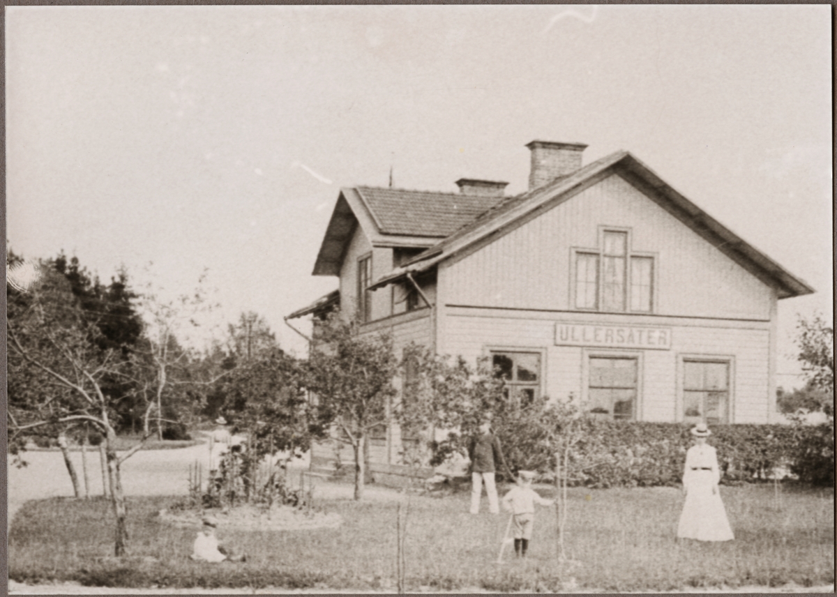 Ullersäters stationshus med stins A V Johansson i trädgården med sin familj i början av 1900-talet. Bilden är tagen av fotograf C J Spetz.