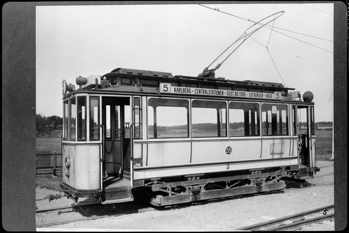 Aktiebolaget Stockholms Spårvägar, SS A1a 3, linje 5, som gick mellan Karlberg och Haga. Fotograferad vid Hagalund järnvägsstation.