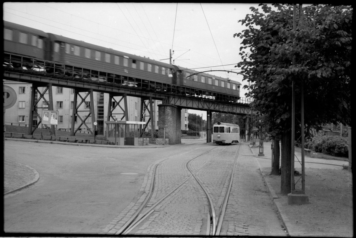 Persontåg passerar på Västkustbane viadukten över spårvägen på Drottninggatan vid Halalid där Helsingborgs Stads Spårvägar, HSS spårvagn trafikerar.