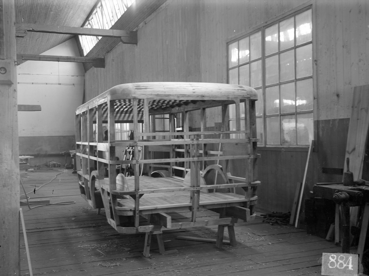 Chevroletbuss under byggnad. AB Svenska Järnvägsverkstädernas verkstad i Linköping. AB Svenska Järnvägsverkstäderna använde främst chassier från Volvo, Skania-Vabis och Shevrolet för att bygga bussar. Tillverkningen av busskarosser skylde sig från kontrakt till att karossen med inredning, målning och andra detaljer blev gjurda.
