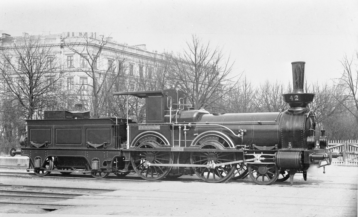 Statens Järnvägar, SJ B 42 "Prins Oscar" vid Lunds station. Tillverkad av Beyer, Peacock & Co och levererades till SJ 1856 och skrotades 1905. Trafikerade södra stambanan.