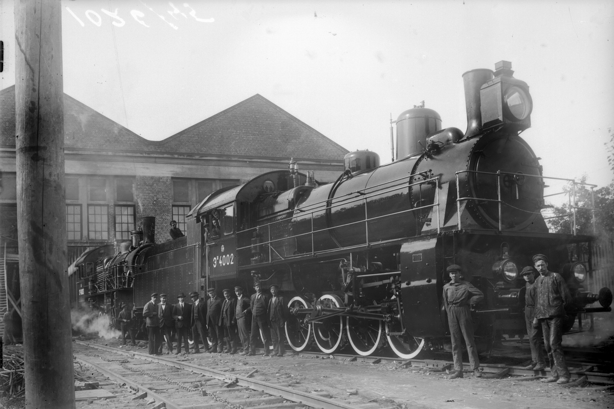 På bilden syns två av de så kallade ryssloken, utanför Nydqvist & Holm ABs verkstad i Trollhättan, främst står lok 4002.