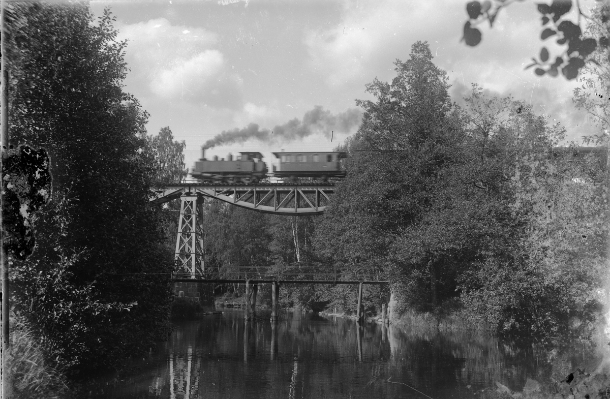 Nora - Karlskoga Järnväg, NKJ, persontåg passerar bron över Järleån.