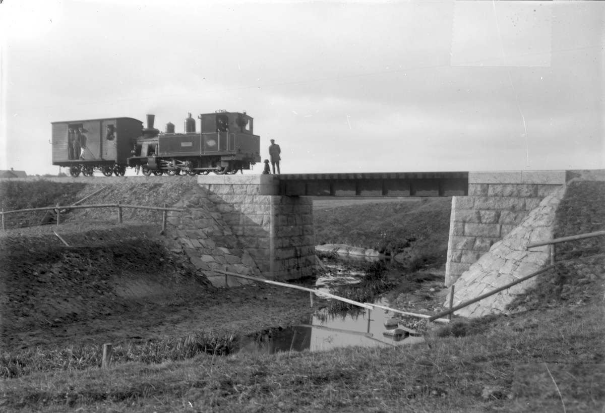 LJ lok 1 med vagn vid bron över Storebergsån, (Lidköping Järnväg)