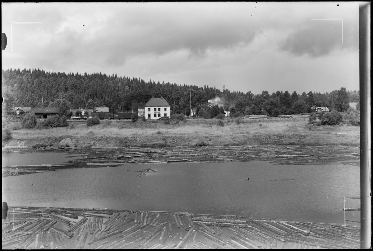 Vy över Rydöbruk station, i förgrunden flottning av timmer.