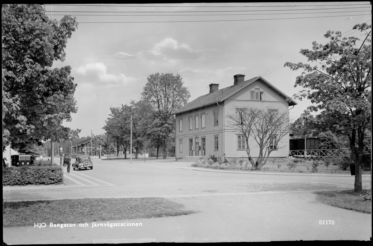 Titel: Bangatan och gatusidan av järnvägsstationen i Hjo.