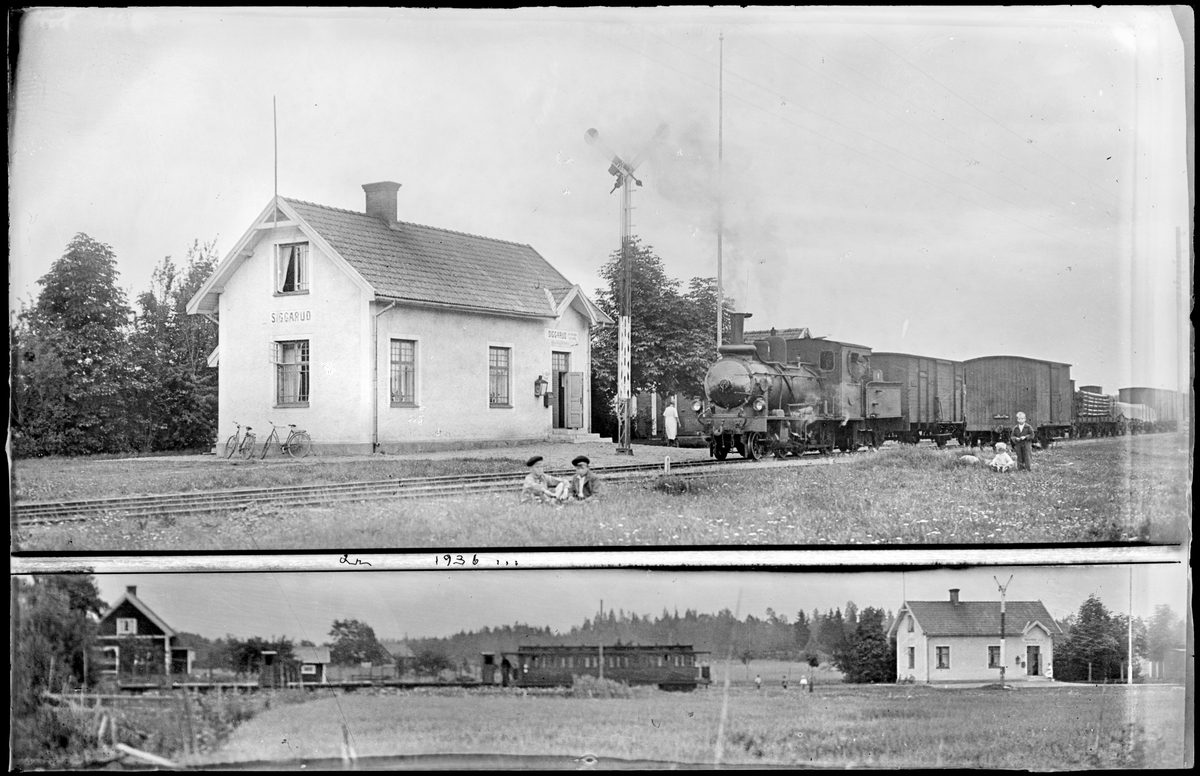 Siggarud station. Västergötland - Göteborgs Järnväg, VGJ lok 9 med godståg.