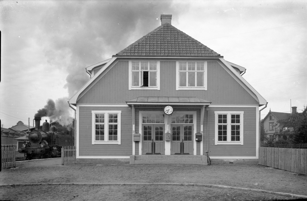 Järnvägsstationen i Tidaholm. Tidaholms Järnväg, TJ lok 1.