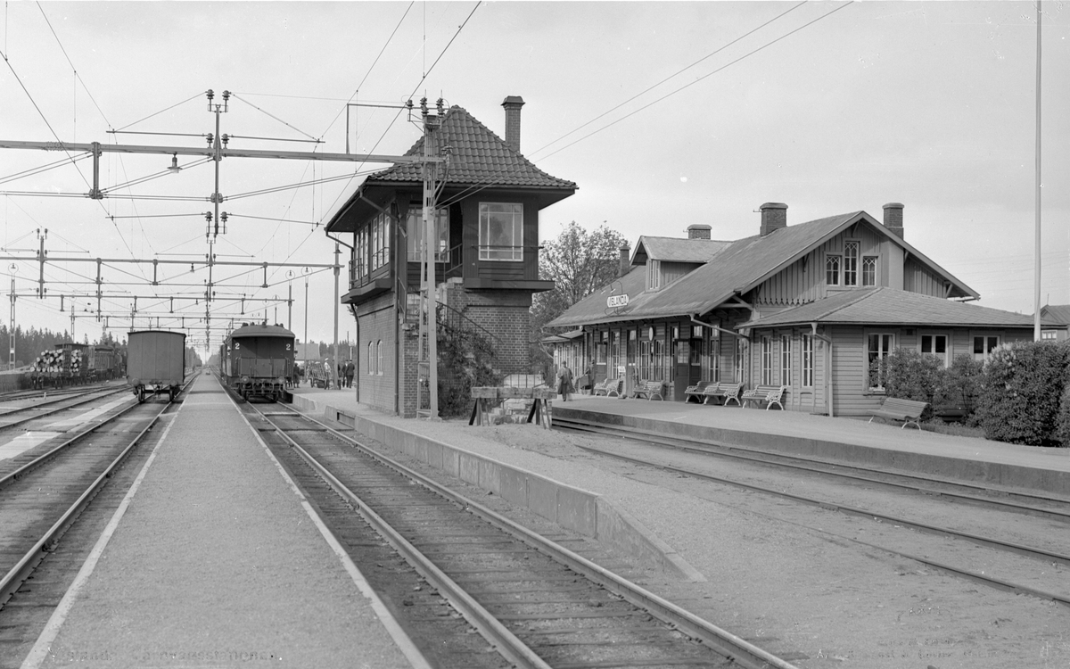 Titel: Visalanda station. I mitten av bilden står ett ställverkshus i tegel och trä.