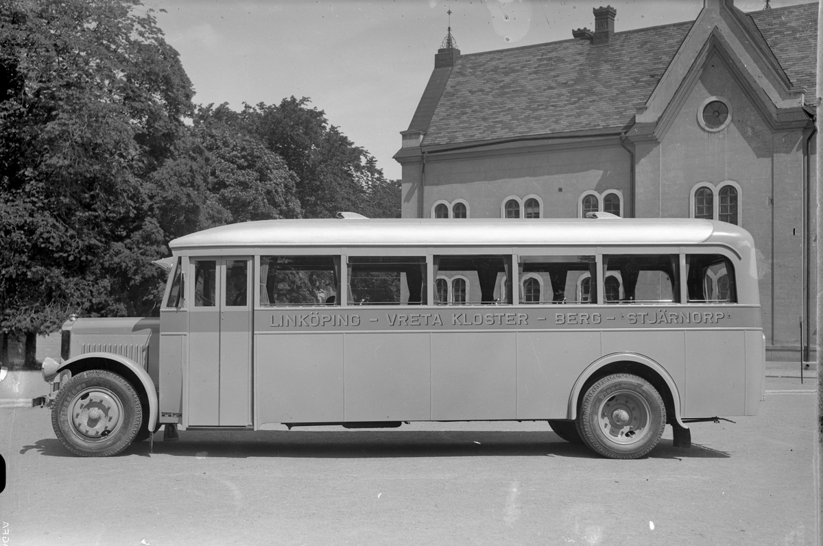 Scania buss för Nilsson, Berg. Stadshuset i bakgrunden. Karossen tillverkad av Aktiebolaget Svenska Järnvägsverkstäderna, ASJ. Leveransfoto.