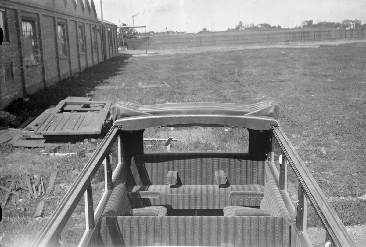 Studebakerbuss för Brännkyrka - Södertörn. Öppet tak. Fotograferad bakom Aktiebolaget svenska Järnvägsverkstäderna, ASJ.