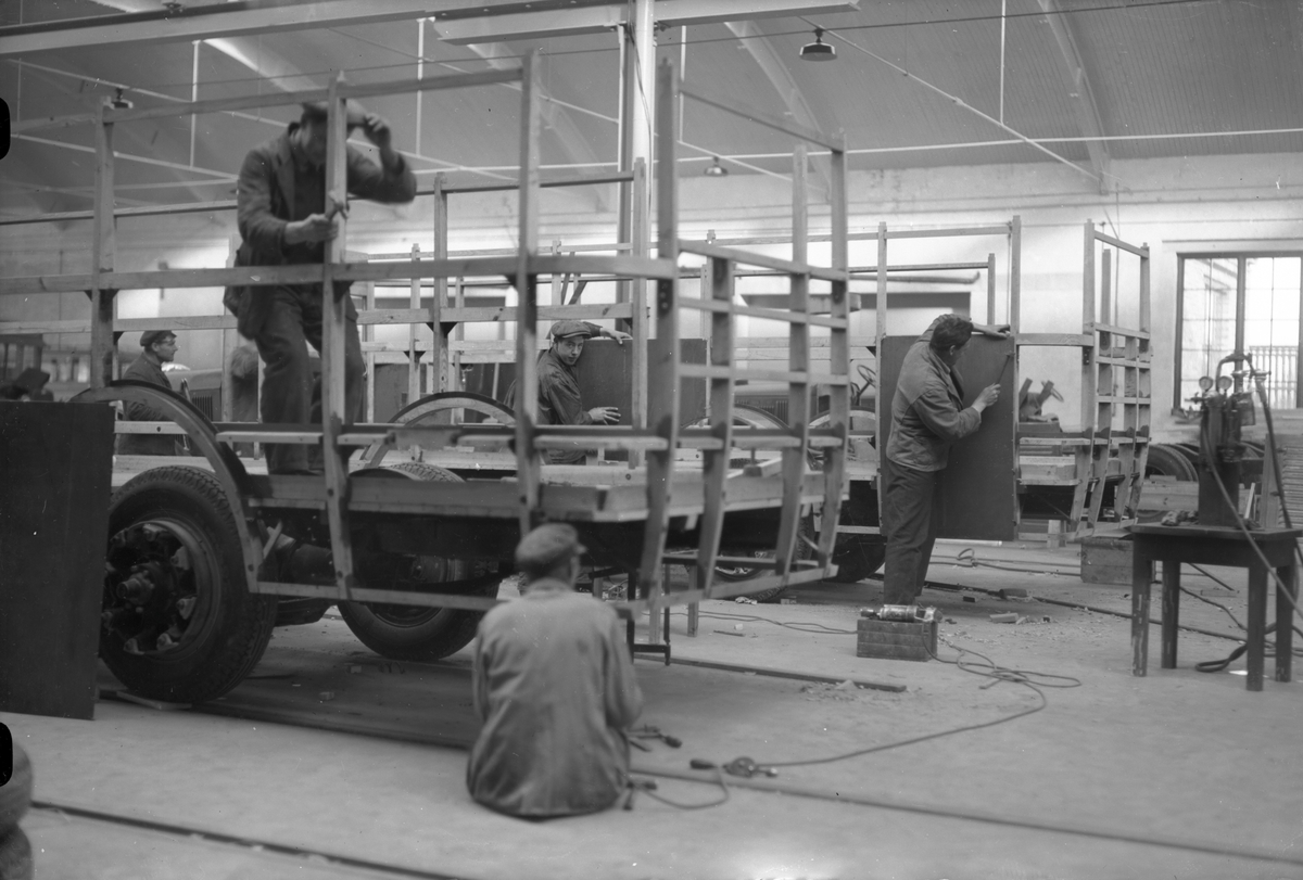 Karosstillverkning i busshallen, Aktiebolaget Svenska Järnvägsverkstäderna, ASJ.