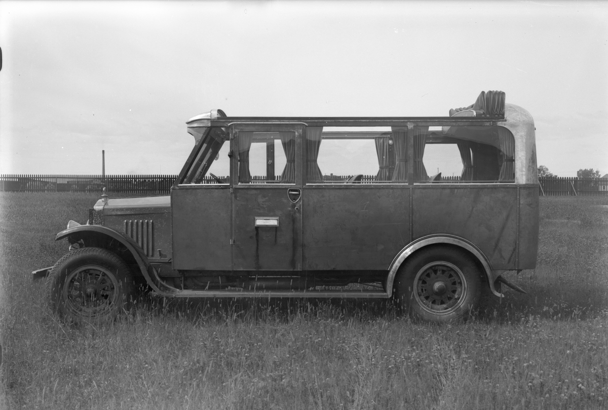 Postverkets Scania-turistbuss. Öppet tak. Karossen tillverkad av Aktiebolaget Svenska Järnvägsverkstäderna, ASJ.