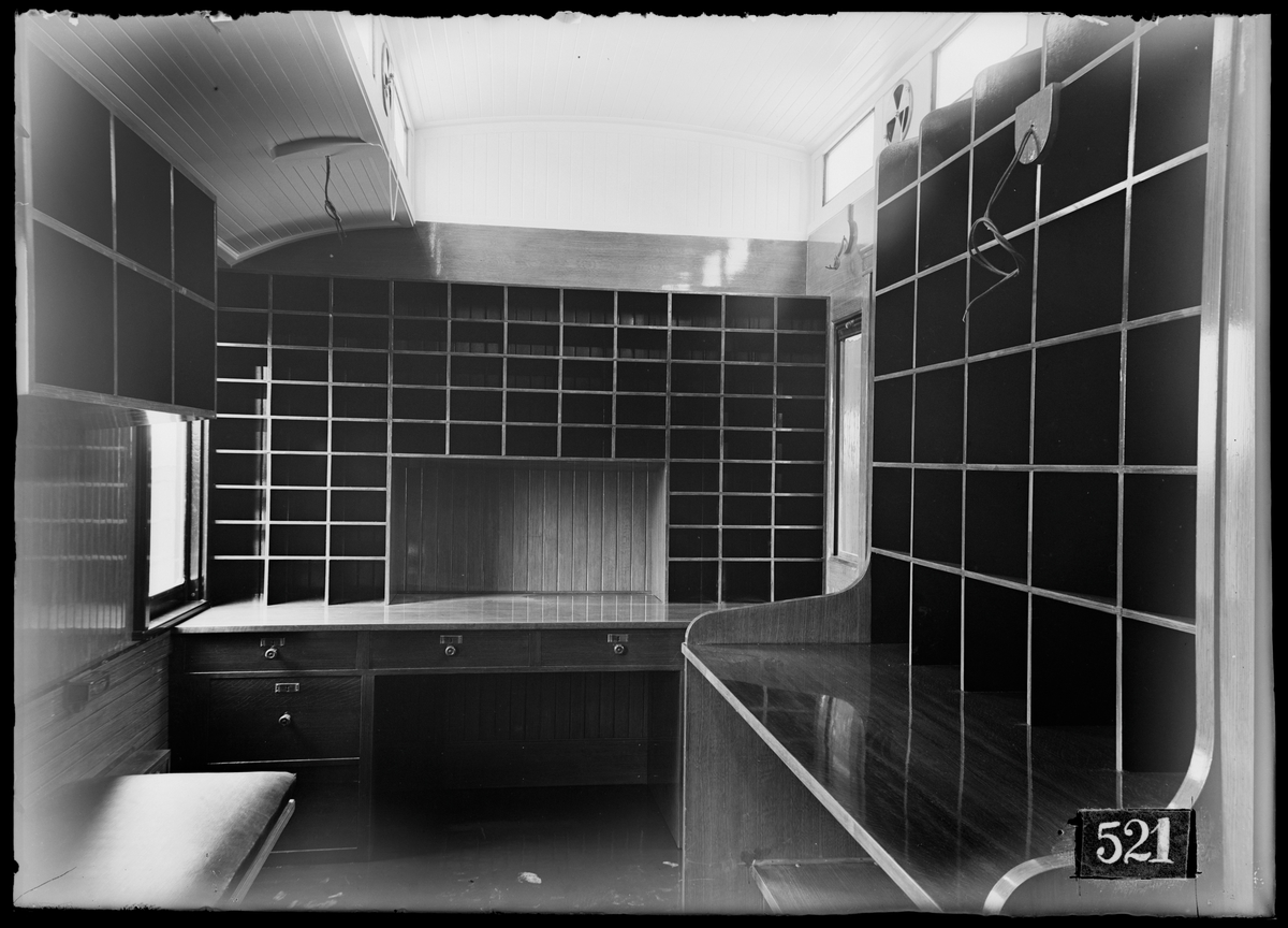 Interiör i norsk postvagn, sorteringsbord. Norges statsbaner, NSB CDFo.