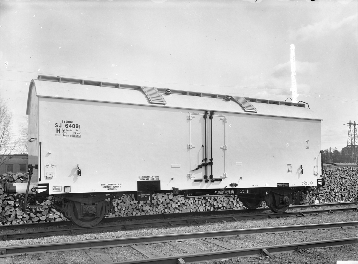 Statens Järnvägar, SJ H 64091. Kylvagn på underrede med hylsbuffertrar, tryckluftsbroms och svetsade plåtväggar.