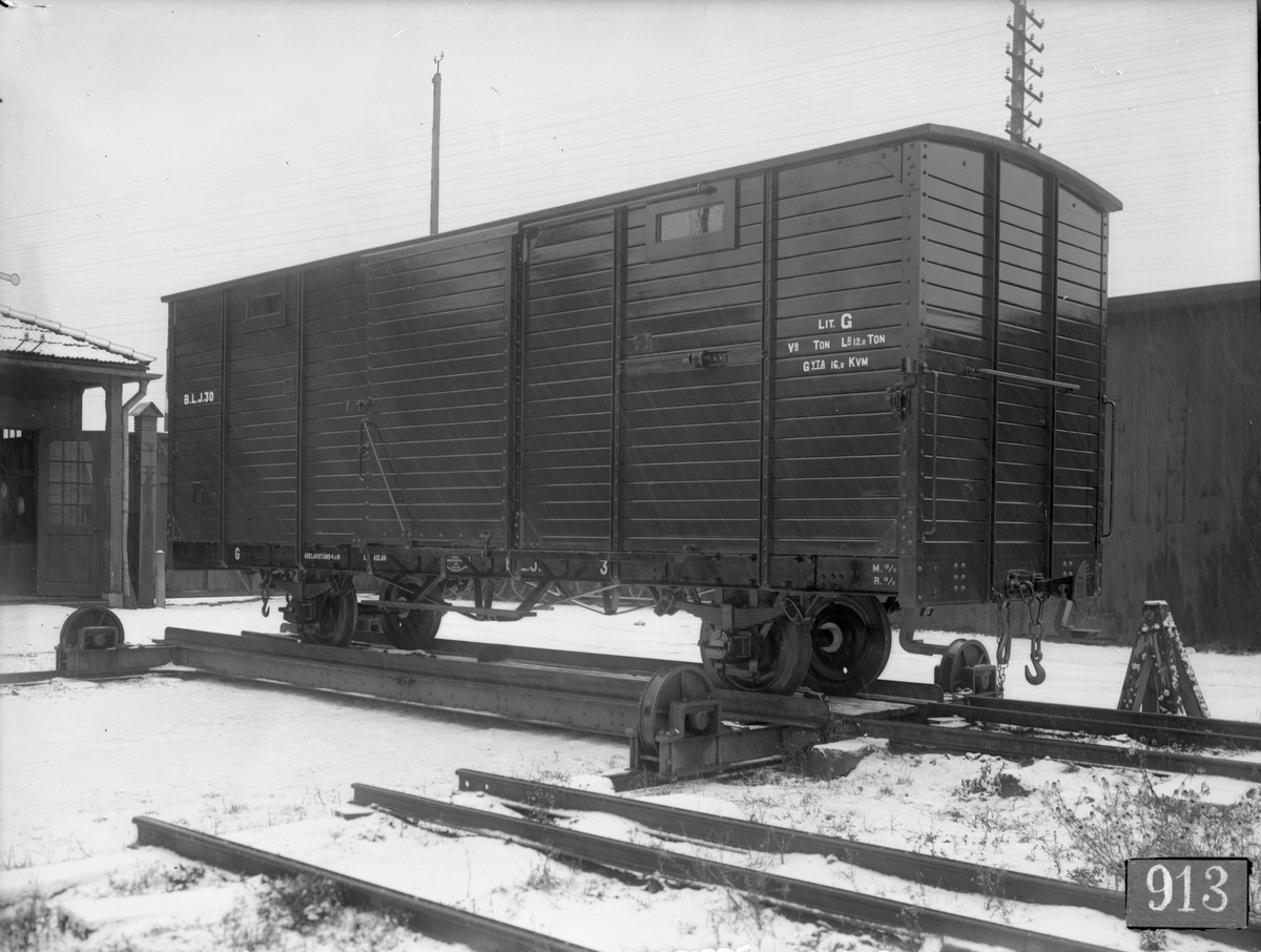Byvalla - Långshyttans Järnväg, BLJ G 30. Vagnen står på en marktravers. Aktiebolaget Svenska Järnvägsverkstäderna, ASJ.