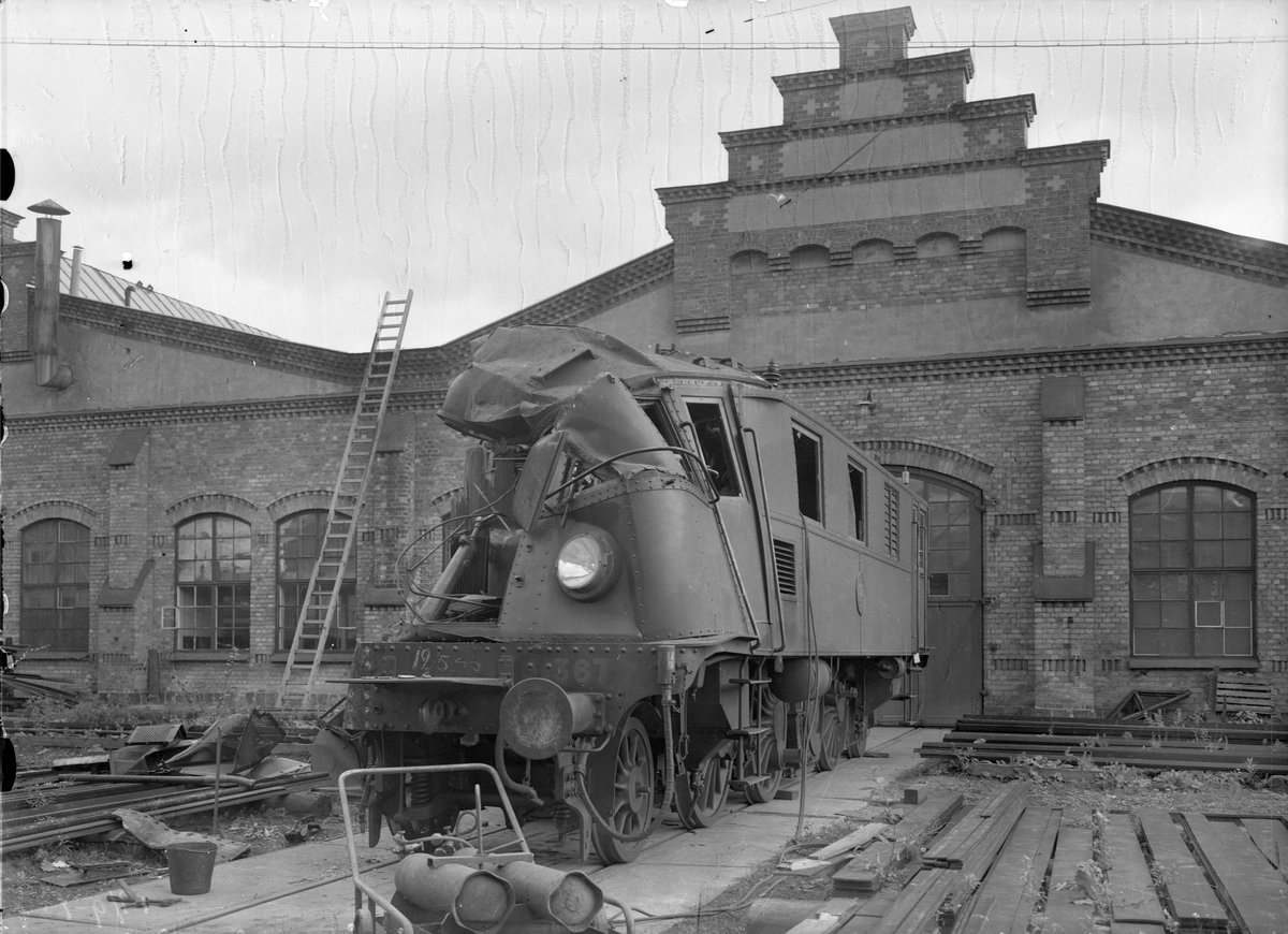 Statens Järnvägar, SJ Dg 367, krockskadat. Vagn- & Maskinfabriken ASJ i Främby utanför Falun