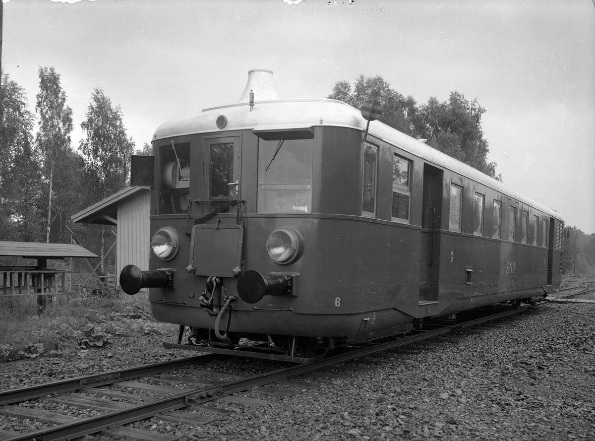 SNJ XCo 6, tillverkades för SJ av DEVA 1937 där den fick littera SJ Xod4 5. Den köptes av Stockholm - Nynäs Järnväg 1946. Bilden tagen 1947 efter revision.