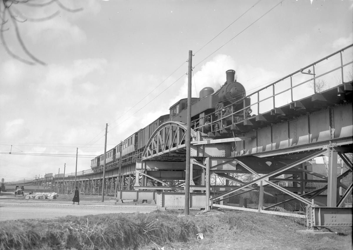 Persontåg Göteborg - Borås Järnväg, GBJ, har just lämnat Göteborg B:s, destination Borås. Ånglok GBJ lok 24 samt GBJ-vagnarna resgodsvagn GBJ F, GBJ BCort 51, GBJ BCo samt GBJ C3.