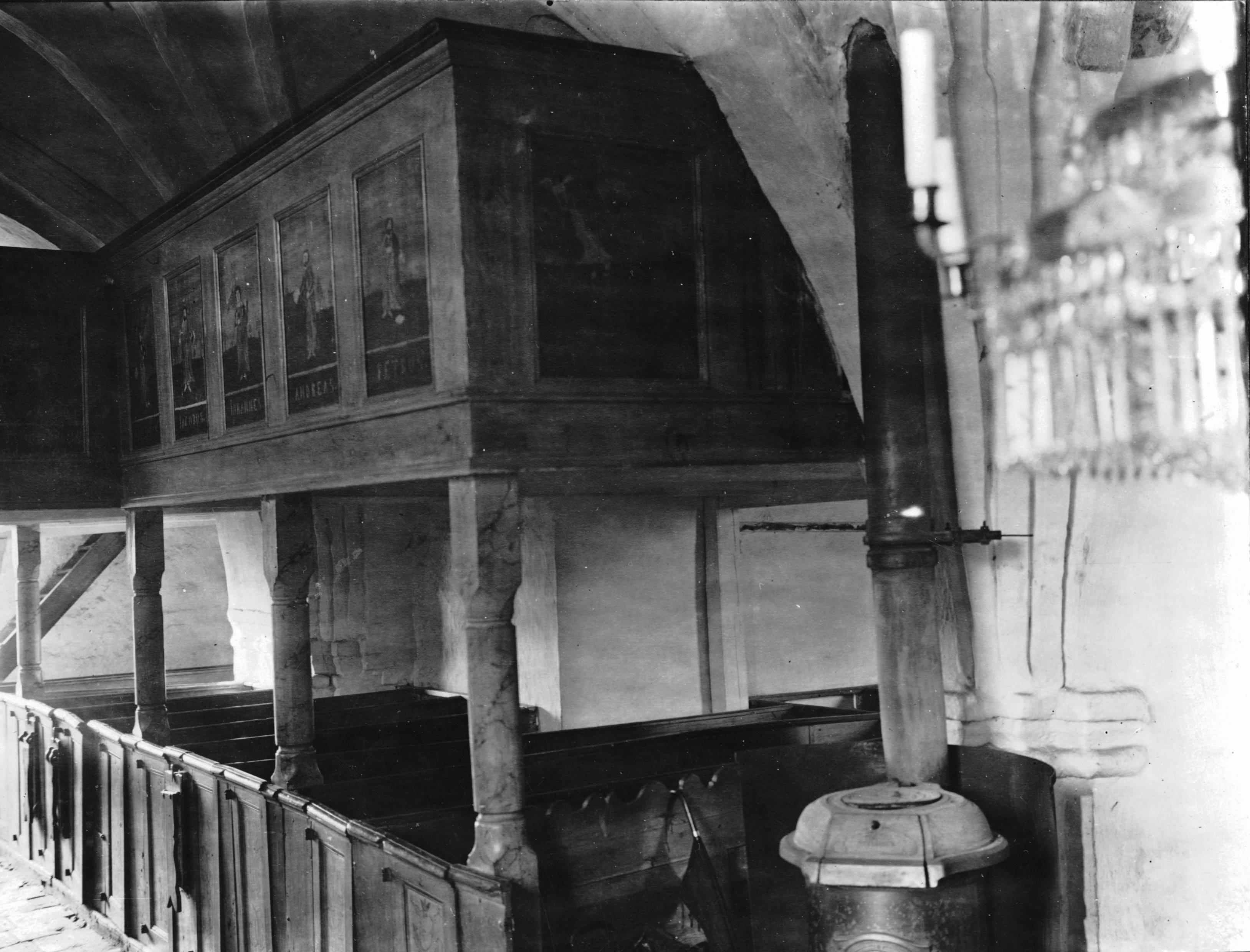 Från sydöst. Till höger mittpelaren mot nykyrkan i bakgrunden läktaren i gammalkyrkan och bakom denna trappa till tornvinden.