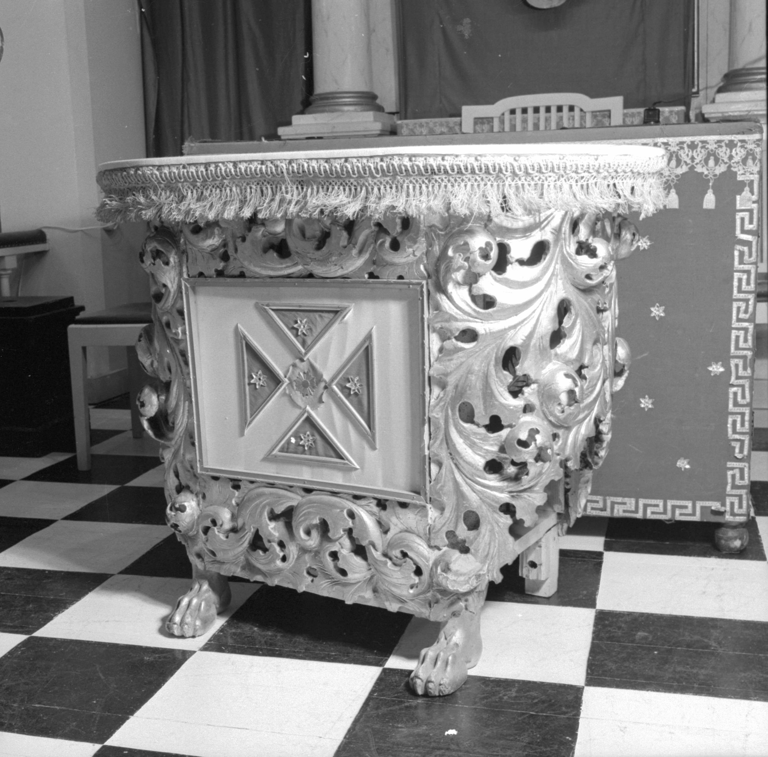 Akantus från västra gamla läktaren sekundärt använt på bord i Odd-Fellows ordenshus, Karlshamn.