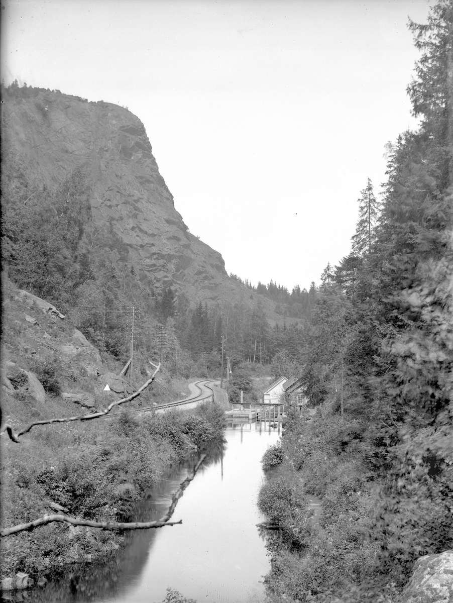 Miljöbild. Järnväg med högt berg i bakgrunden.