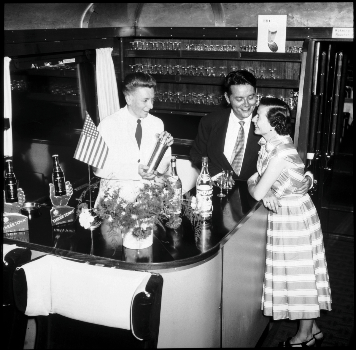 Interiör barvagnen, Swedish Night Light Cruising, SNLC. "Dollartåget" uppkom som ett försök att minska efterkrigstidens valutabrist, man riktade sig i första hand till köpstarka amerikanska turister, därav det myntade namnet