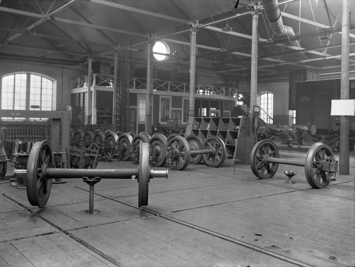 Titel: Verkstadsinteriör Pneumatisk vändapparat för vagnshjul