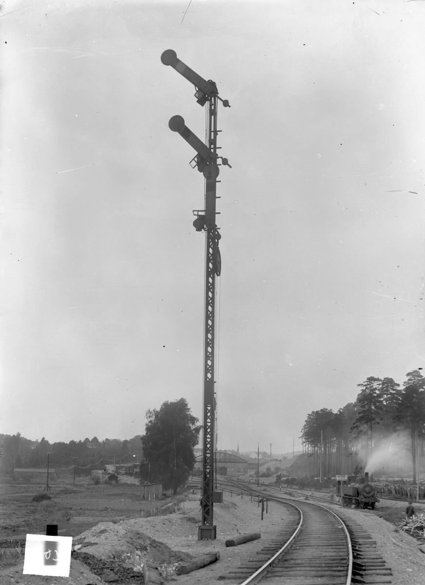 Tvåvingad semafor, i läge "kör varsamt", vid infarten till Södertälje från Saltskog. Loket står på det spår som leder till Lokstallet.