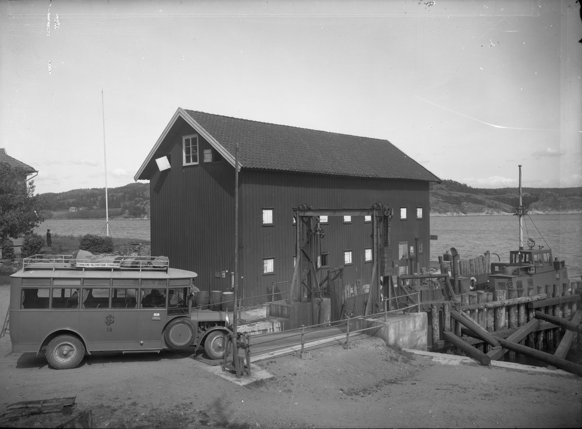 Statens Järnvägar, SJ buss 12 som är på väg att borda (eller backa av) färjan till Hälleviksstrand