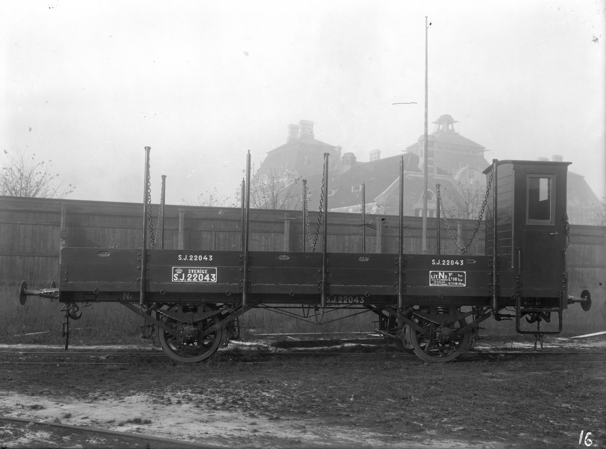 Statens Järnvägar, SJ N3 22043. Stolpvagn med bromshytt tillverkad av Kockums Mekaniska Verkstads AB