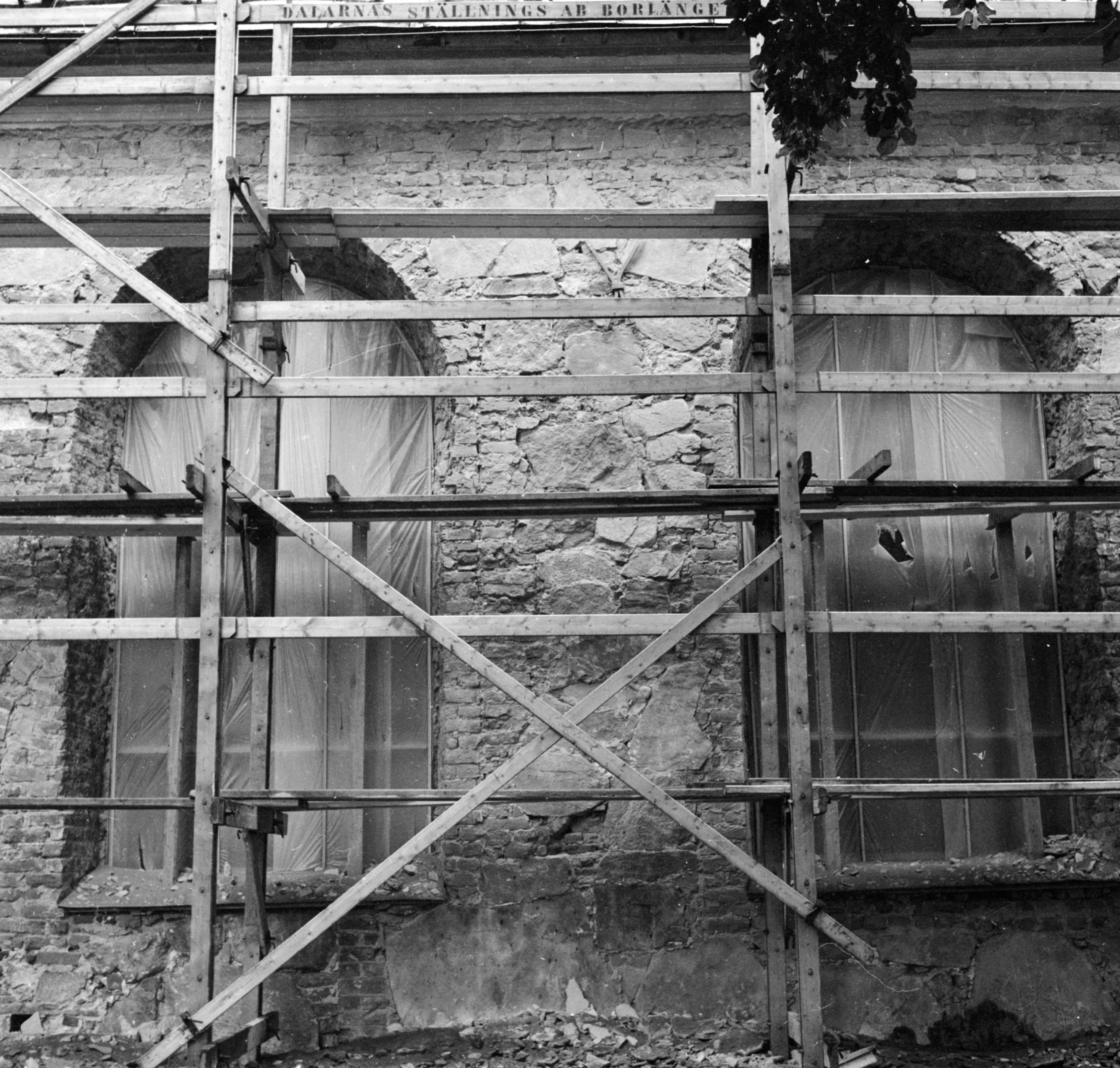 Långhusets sydfasad fotograferad från väster mot öster. Byggnadshistorisk undersökning i samband med omputsning 1963. Foto nr. 29.