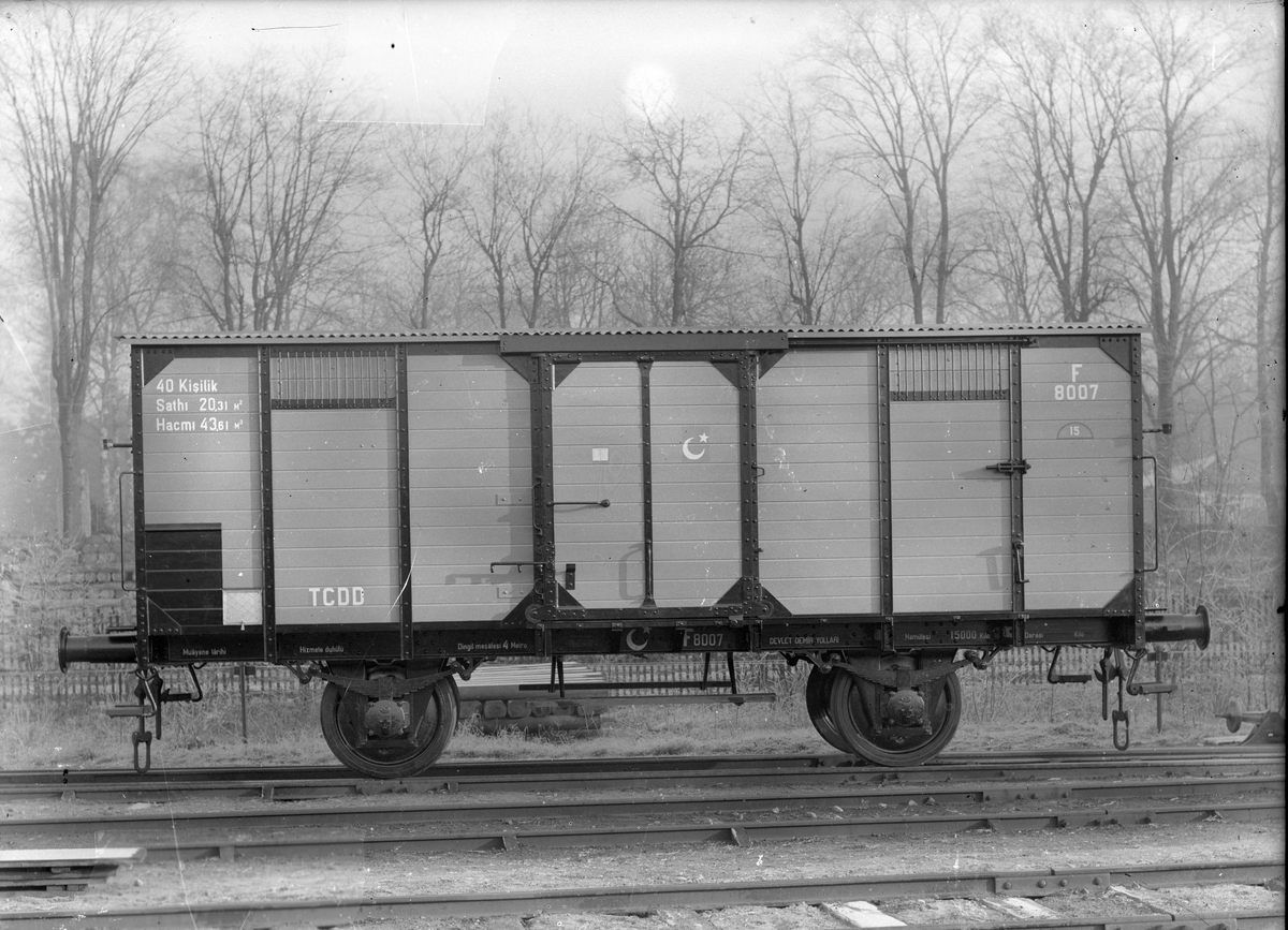 TCDD - Türkiye Cumhuriyeti Devlet Demiryollari, den statliga järnvägen i Turkiet.Täckt obromsad godsvagn F 8007. Nydqvist & Holm AB, NOHAB