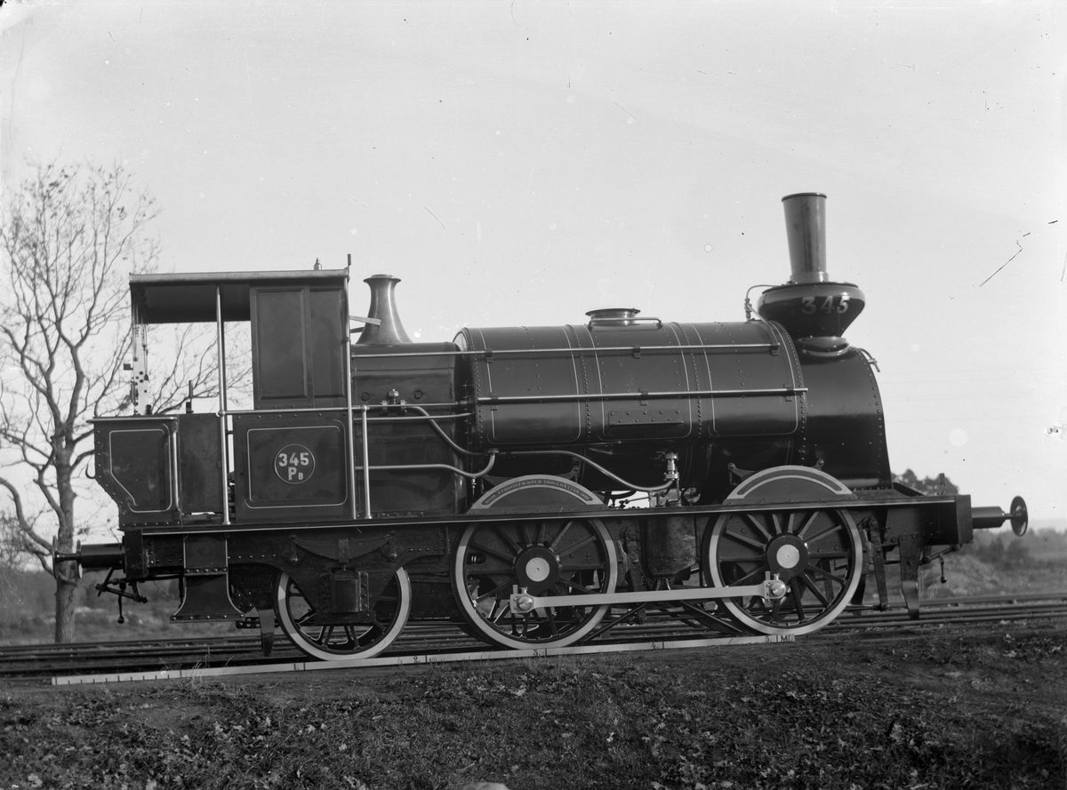 Statens Järnvägar, SJ Pb 345. Leveransfoto. Loket tillverkades av Nohab och hade högsta hastighet 60 km i timme. Loket var slopad 1908 och såld 1909 till skrot.