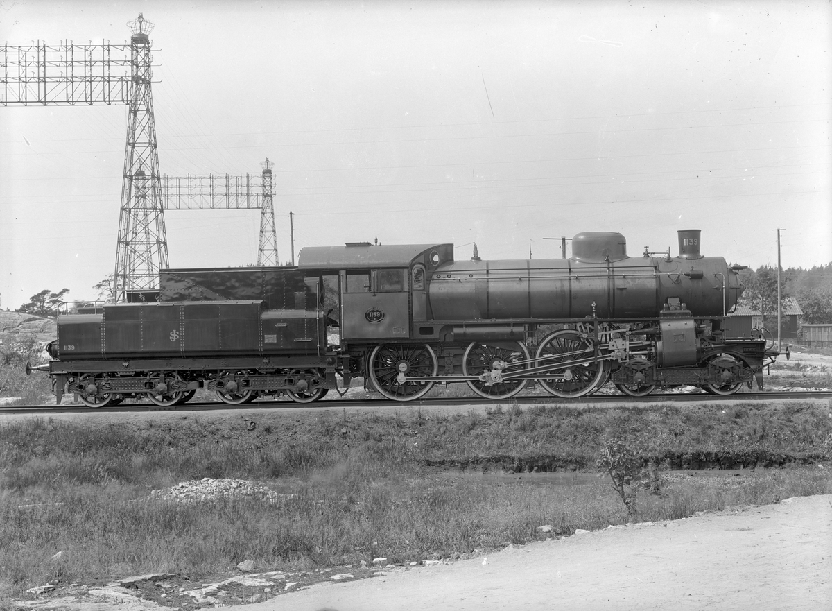 Statens Järnvägar, SJ B 1139. Loket tillverkades av Nohab och hade högsta hastighet 90 km i timme. Bilden är troligen tagen vid leveransen. Uppställt i Alvesta 1992.