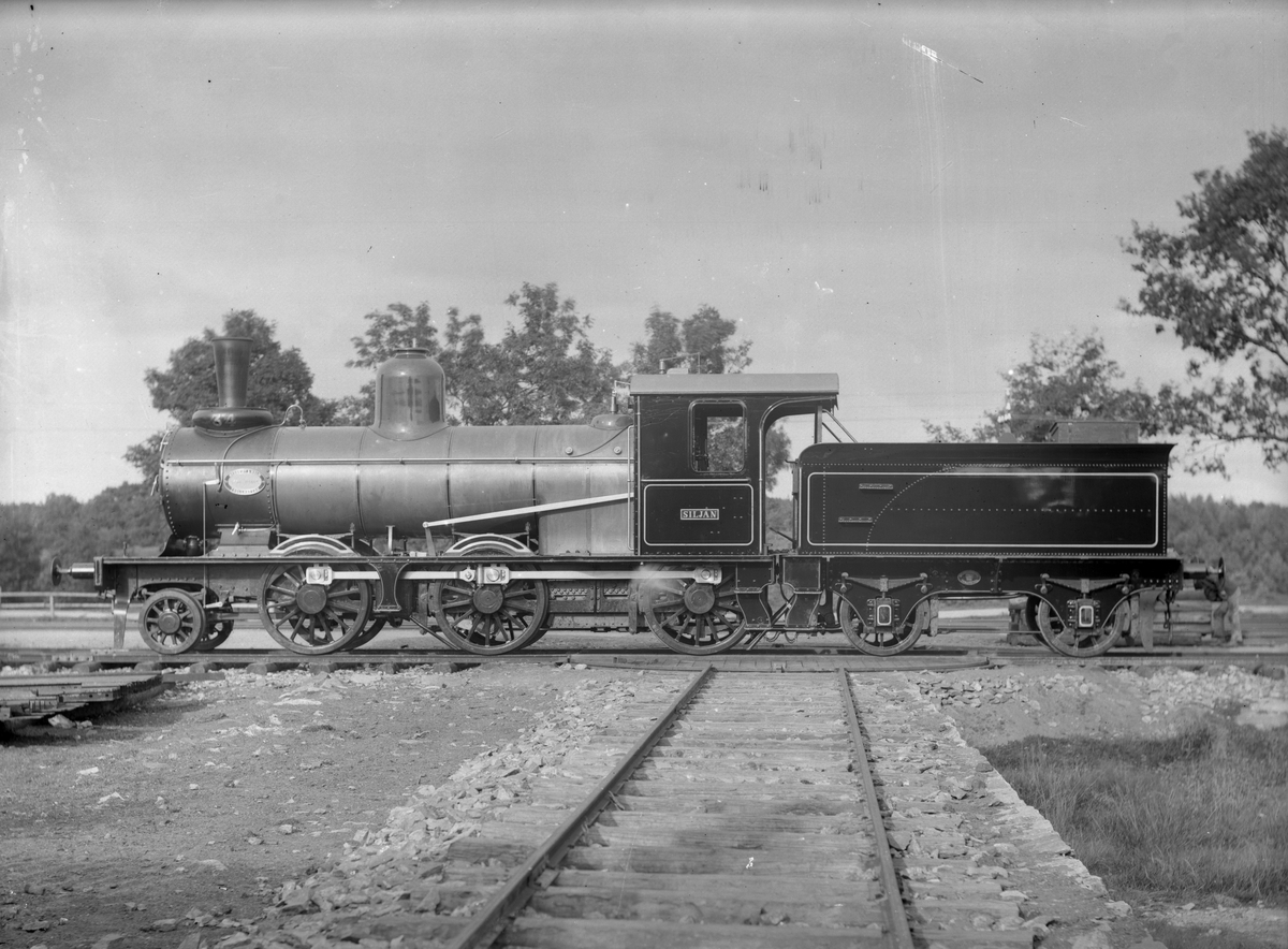 GDJ F 34. Leveransfoto. Ånglok på vändskiva. Fick namnet Siljan. Loket tillverkades av Nohab. Skrotades 1952.