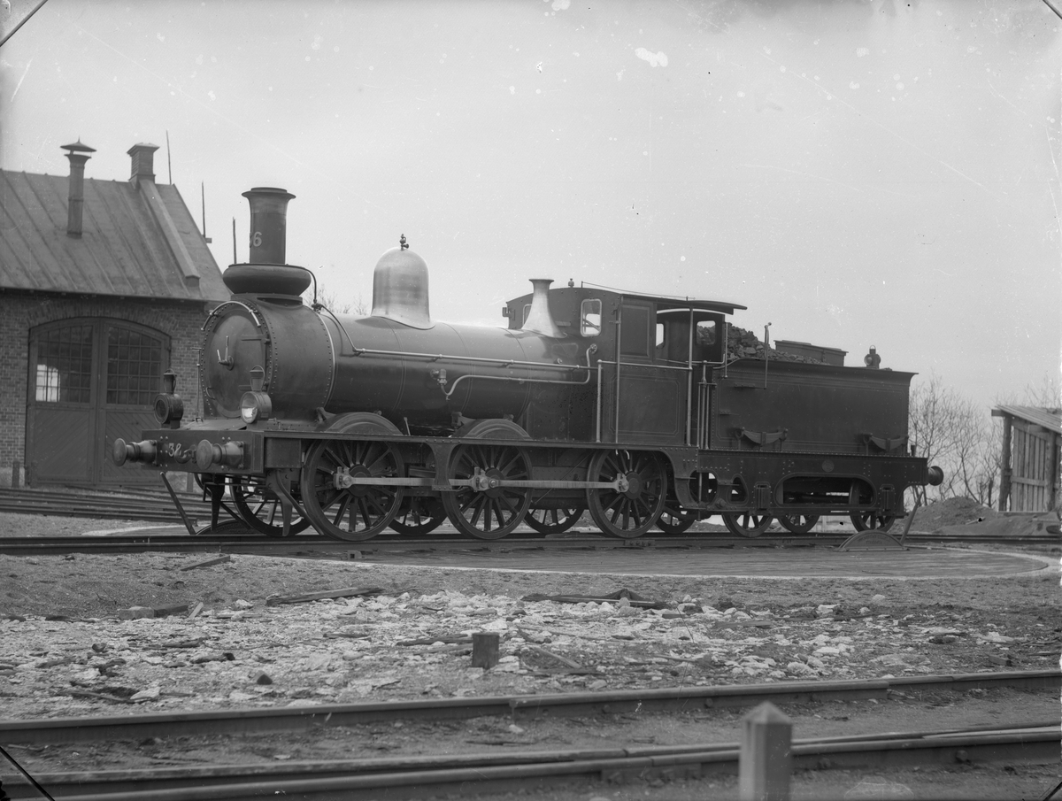 SWB K 36. Ånglok på vändskiva. Loket tillverkades av Nohab. Bilden är troligen tagen vid leveransen. Skrotades 1922.