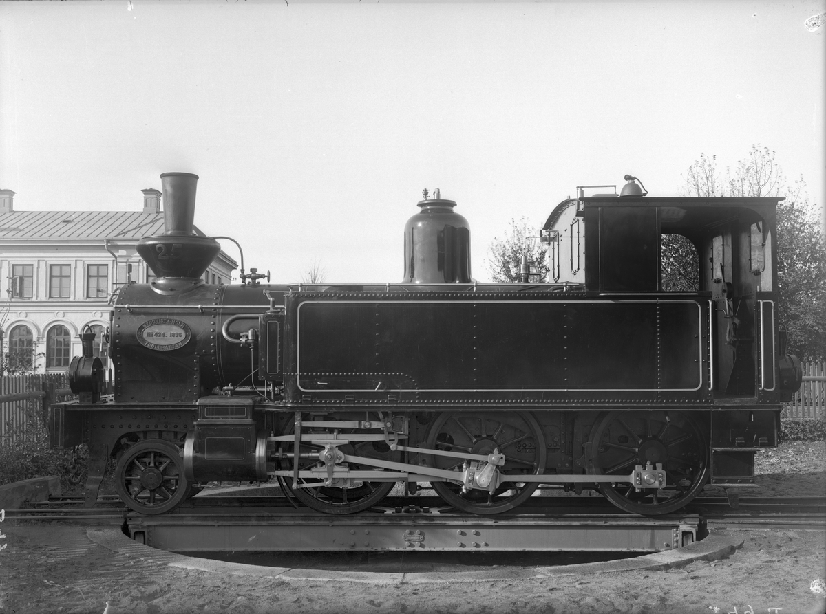 MBlJ lok 26. Ånglok på vändskiva. Leveransfoto. Loket tillverkades av Nohab. Det var felaktigt märkt 25 vid leveransen. Loket skrotades 1959.