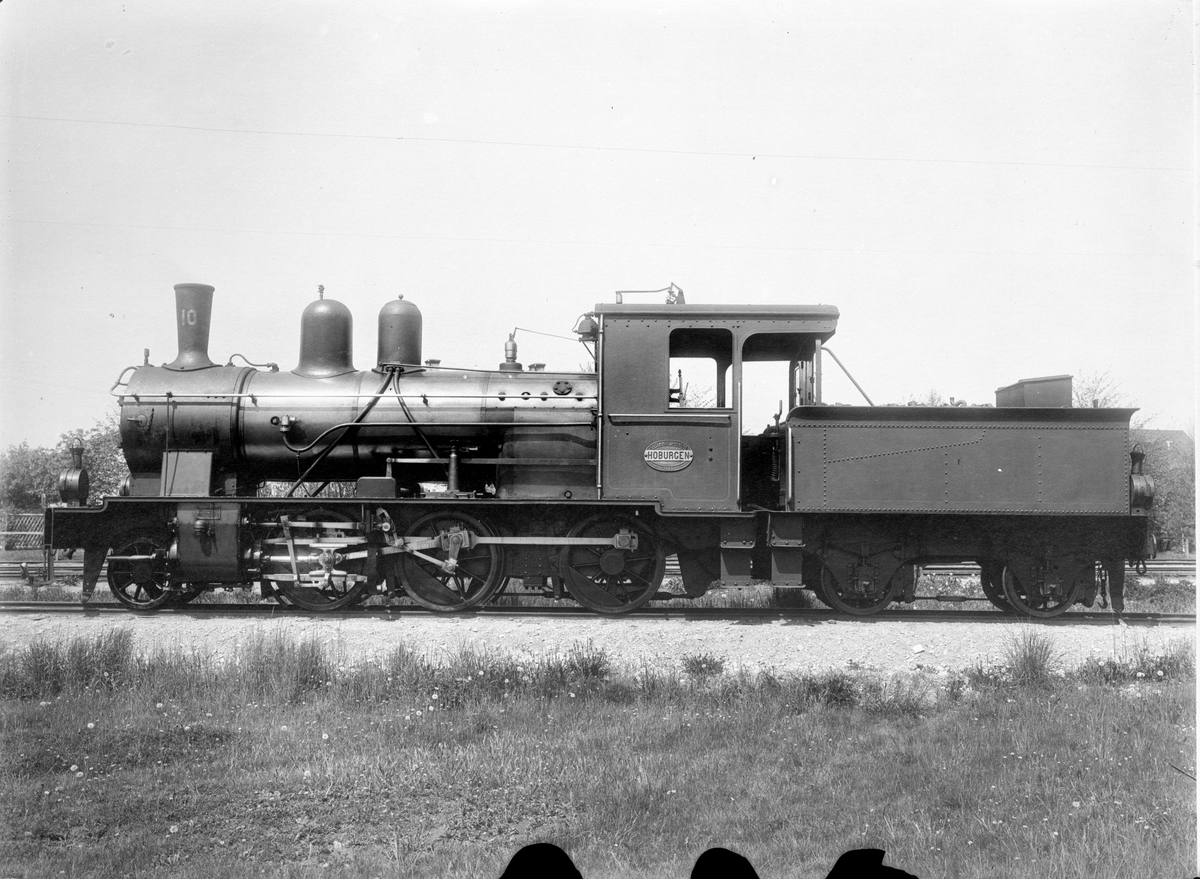 GJ lok 10. Fick namnet Hoburgen. Leveransfoto. Loket tillverkades av Nohab, tillverkningsnummer 900. Såldes 1948 till Sveriges Järnvägar, fick littera SJ L19p 3069. Skrotades 1968.