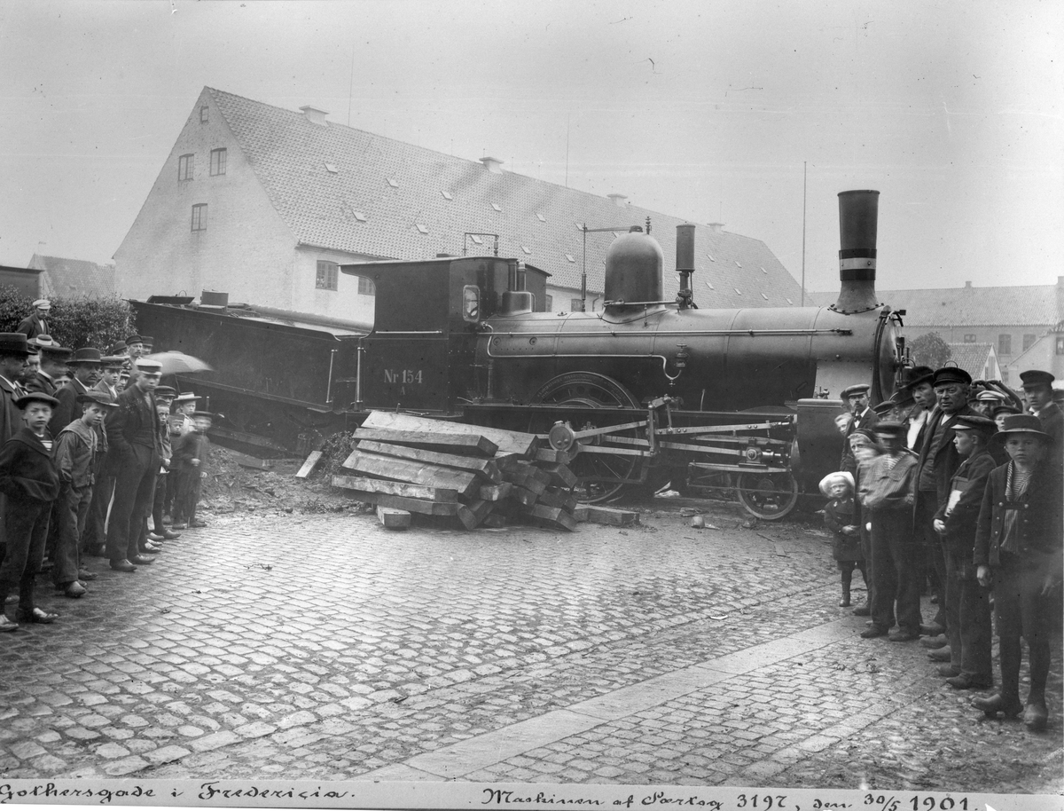 DSB A 154. Tåg med ånglok urspårat i Fredericia, Danmark.