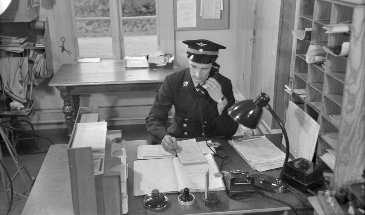 Statens Järnvägar, SJ säkerhetstjänst. Tågklarerare med uppgift att övervaka tågens rörelser. Grafisk tidstabell.