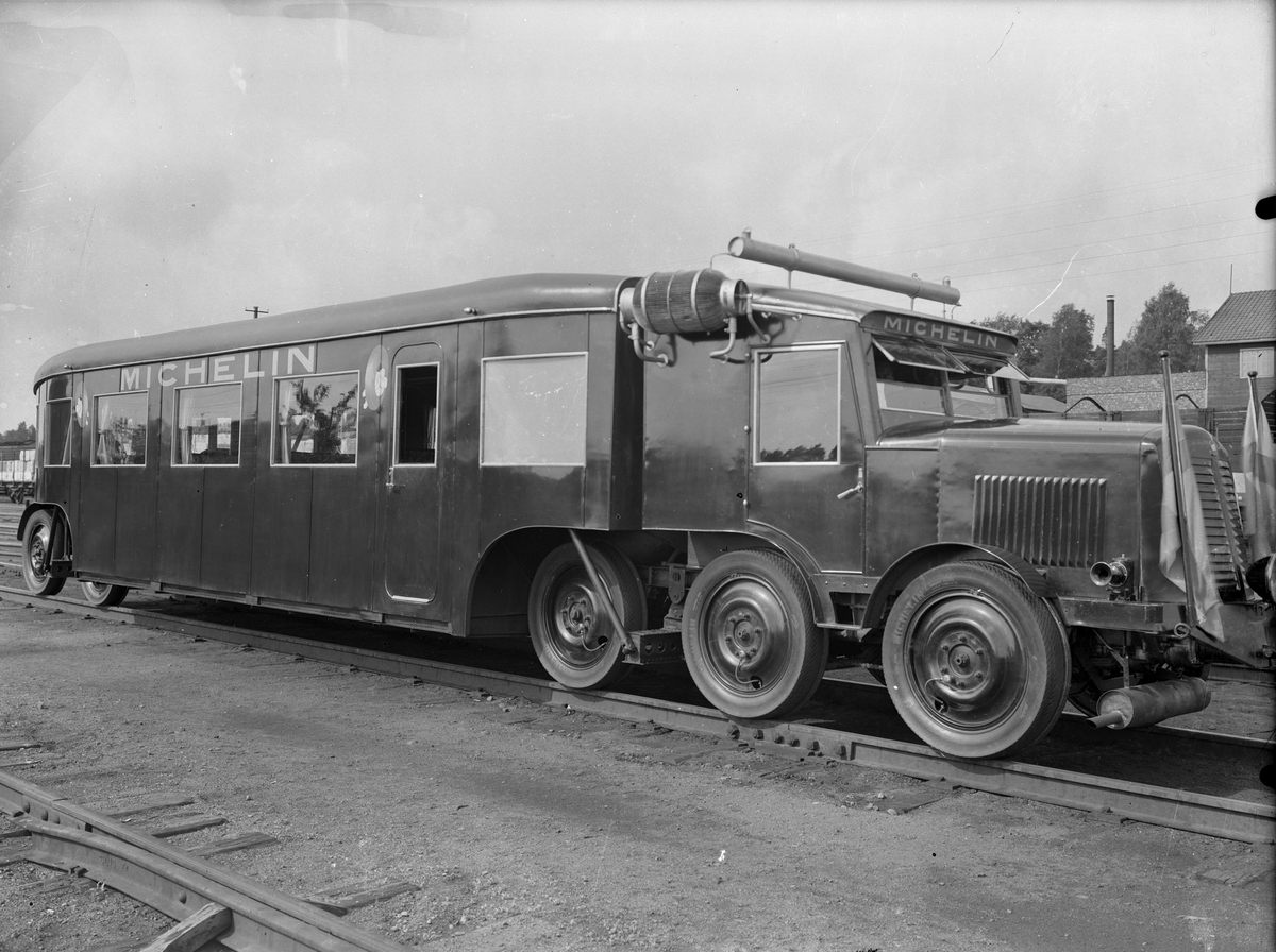 Titel: Michelinvagnen demonstrationskördes i Sverige 1932.
