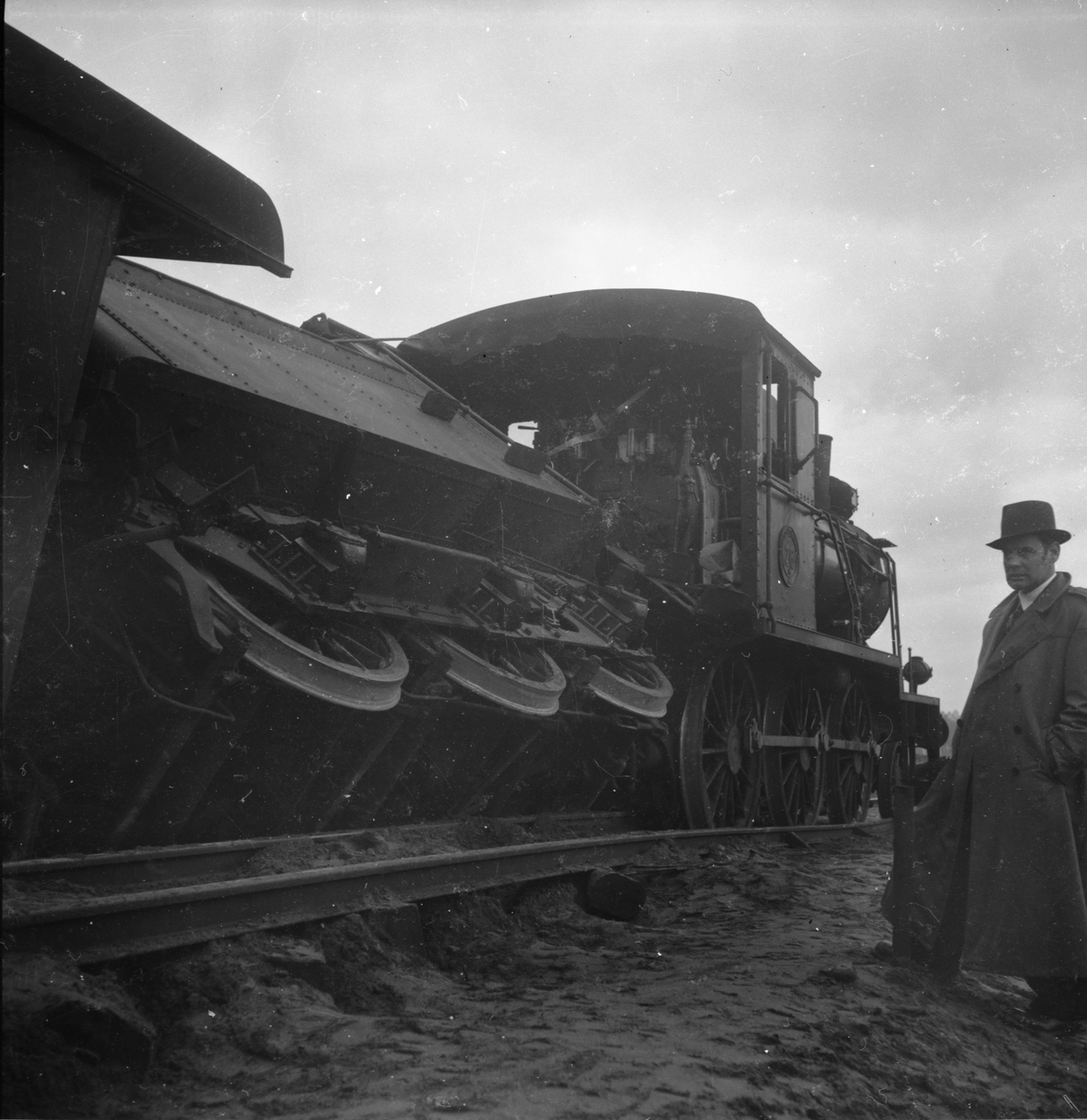 Till höger i bild står ånglok HNJ lok 28, följt av den urspårade tendern och längst till vänster skymtas resgodsvagn HNJ F3 761.