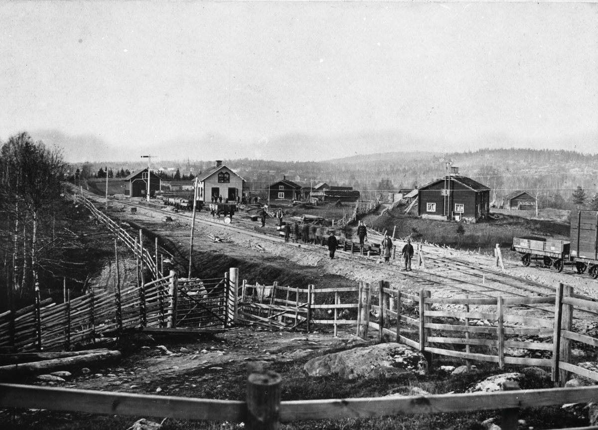 Bånghammar järnvägsstation. Stationen byggdes av Frövi Ludvika Järnväg, FLJ, 1873. På bilden pågår arbetet med att ansluta linjen Bånghammar - Klotens Järnväg, BKJ, vilket skedde 1876.