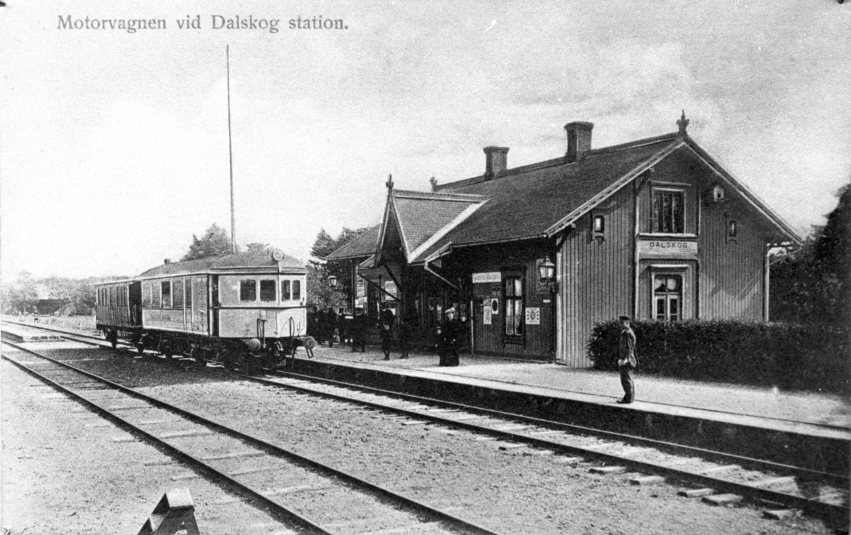 Vykort föreställande Dalskog järnvägsstation. På spåret syns ångmotorvagnen "August" med släp. Ångmotorvagnen August byggdes av Arlövs Mekaniska Verkstad och levererades 1907.